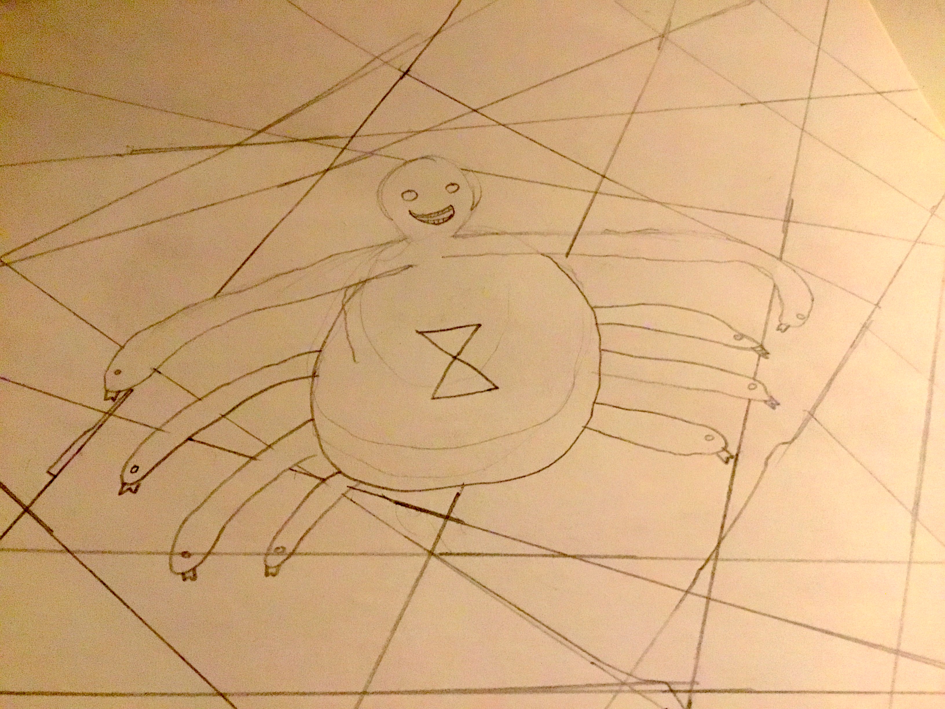 Description: Giant spider with snake arms wearing an inside out murderer mask